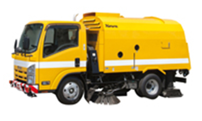 - 高速道路、一般道路、工場構内等の舗装面のゴミ、土砂などを清掃する特装車です。